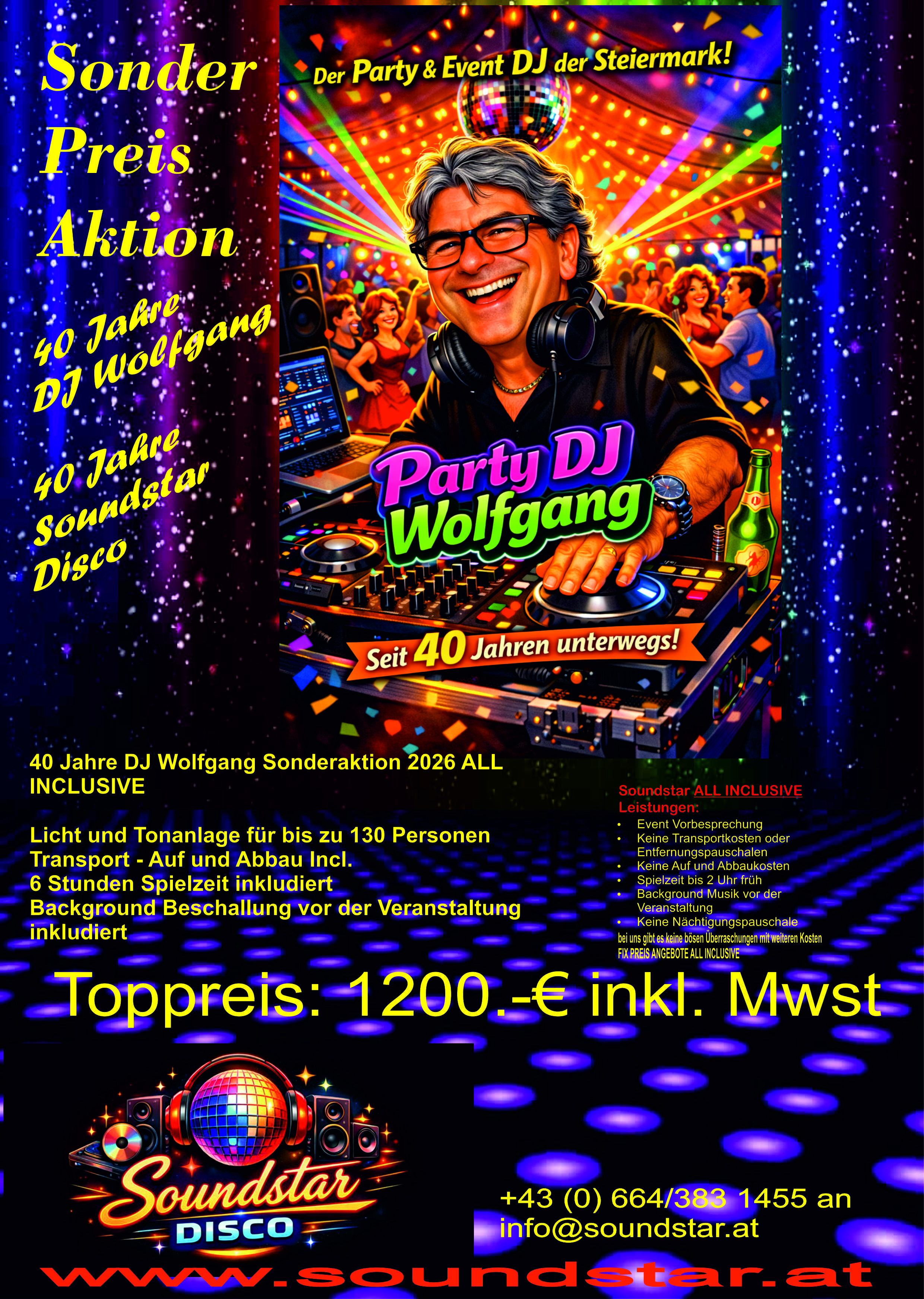 Wir planen jetzt schon die Saison 2026 und es sind schon einige Termine weg da es in der Saison 2026 sicher immer eine Überraschung ( z.b. Upgrade Anlage ) bei jeder Veranstaltung gibt, da ich im Jahr 2026 40 Jahre als DJ unterwegs, bin unter dem Motto 40 Jahre und kein bisschen leise „ The Party must go on „